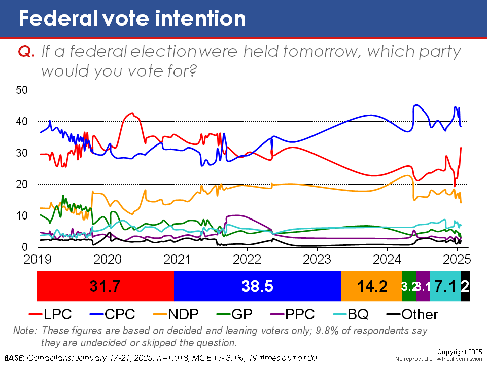 I think the question to ask is whether the LPC bump, if there is one, is good because there's no leader or because of the prospective leader(s).Perhaps the public really soured on Trudeau, perhaps the public really like Carney, perhaps both or perhaps neither. Too early to say!
