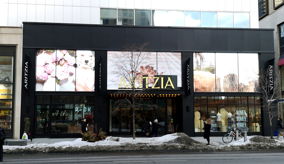 The new Aritzia, complete with 4 video screens and an indoor cafe along with a beautiful interior.
