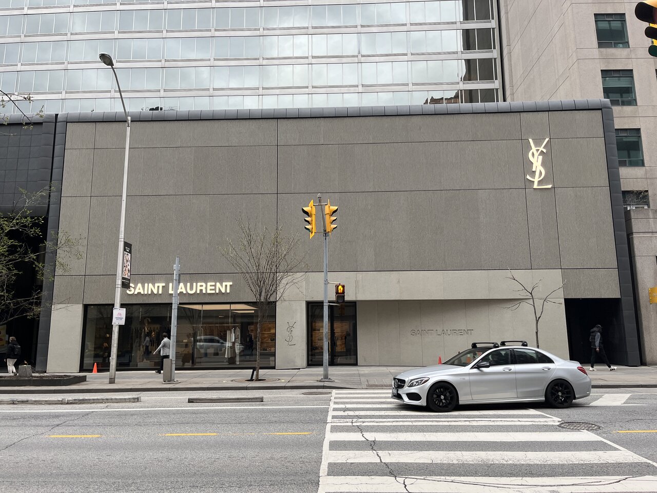 When I saw the picture, I thought it was just the light that made it look like brutalist concrete panels, it was probably some beige/golden-ish vertical slats. I walked by to check it out this afternoon - yup, brutalist concrete panels. Probably could win an award for the ugliest YSL store facade in the world if there was such a thing.Someone approved spending good money on that facade. They should be looking for a different line of work.