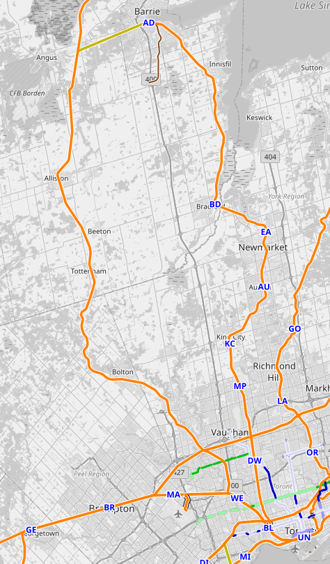 While Bolton-Alliston is maybe 60% of Bolton-Union, it quite clearly is not that much of a longer route to Barrie overall. The way I see it is the inverse; this line could pull growth up along it, up to a level of growth comparable to everything north of Richmond Hill (suburban-exurban...), ie the Barrie corridor. Said corridor itself was not nearly so urbanized 40 years ago- GO service did not cause that suburbanization per se, but the distances involved are clearly not too great for most commuters.Look at the distances involved, and how little there is north of Bolton. I don't have a mileage chart for the MacTier handy but it looks like Alliston-Bolton is a decent % of Bolton-Union.