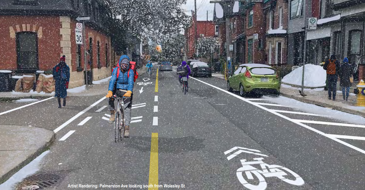 As for the bus shelter, obviously a shelter in Toronto needs to be more substantial than one in Amsterdam, and there is no reason why the shelter couldn't be made larger with the same layout. The shelter can also be placed on the other side of the cycle track if necessary.