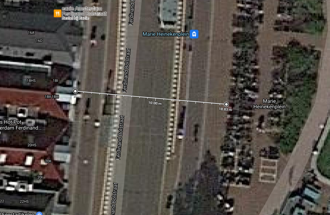 That tram stop in Amsterdam is on Ferdinand Bolstraat, a very narrow street significantly narrower than any relevant Toronto street. The typical distance between building facades on that section of Ferdinand Bolstraat is about 14m, so narrow that the tram is single track. Where this specific stop is located, there is a square off to one side and the street widens a little bit in order to accommodate this tram stop as well as double track, to about 18-19m measure from building facade to the bicycle parking on the other side: