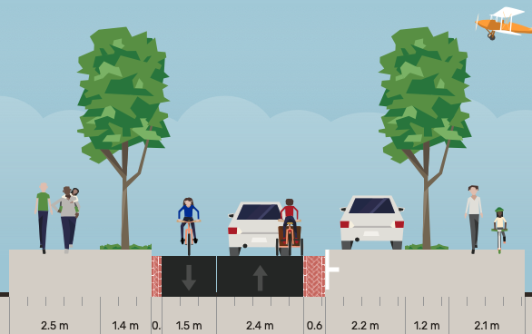 The public ROW on Portland seems to be about 14.2 m based on the satellite images. Here's a concept for how that could look as a