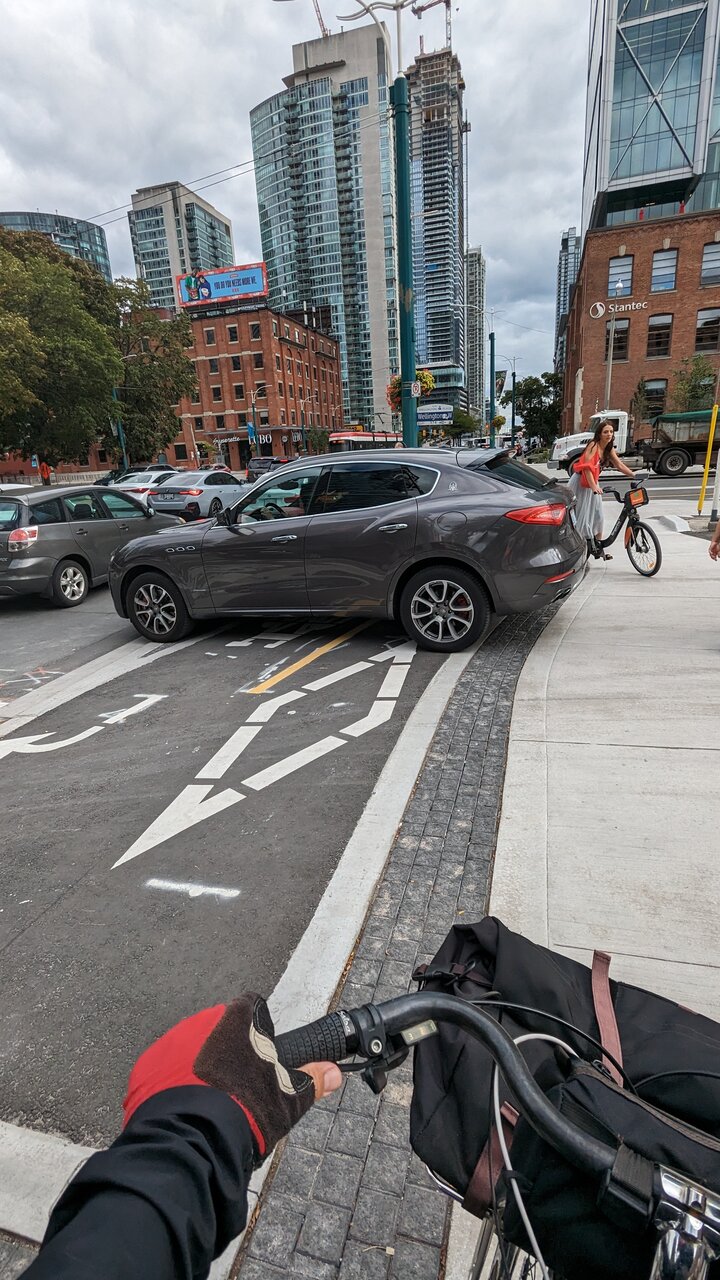To add to this very fine breakdown of otherwise very fine new infrastructure, this is case and point of a mistake that the Cycling unit keeps making and really has to fix: wide bike lanes are great once you’re in them, but also readily invite drivers to enter unless/until they put bollards in the middle of each entrance. I’ve not yet ridden the Wellington bike lanes when there has not been a driver parked in them.