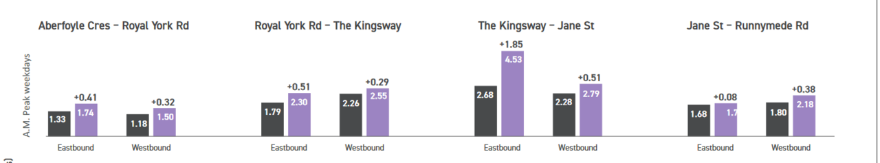 Clearly the Kingway - Jane Segment is the real problem. The other increases are much less substantial. Add the other 3 segments together and the impact is ~1M to AM Peak EB travel times. Its that large difference in the one segment that's a real problem. Its fixable.