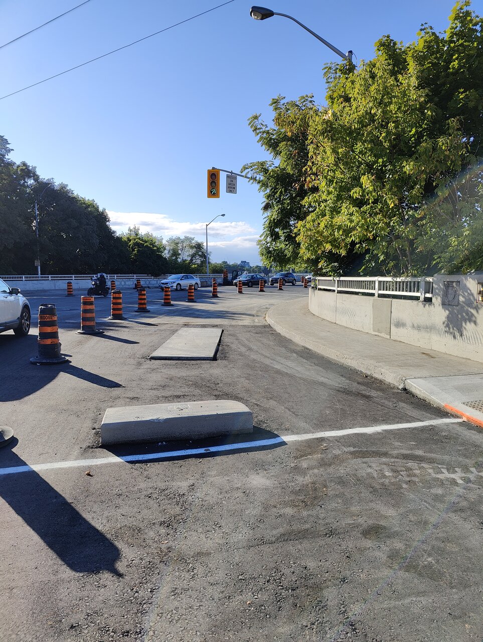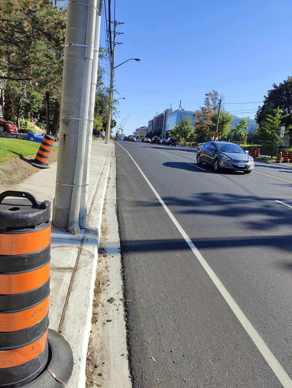 Yeah, it looks like they redid the sidewalk and curb here, if the intention is to narrow the lanes to slow cars down, they could have just made the sidewalk wider?