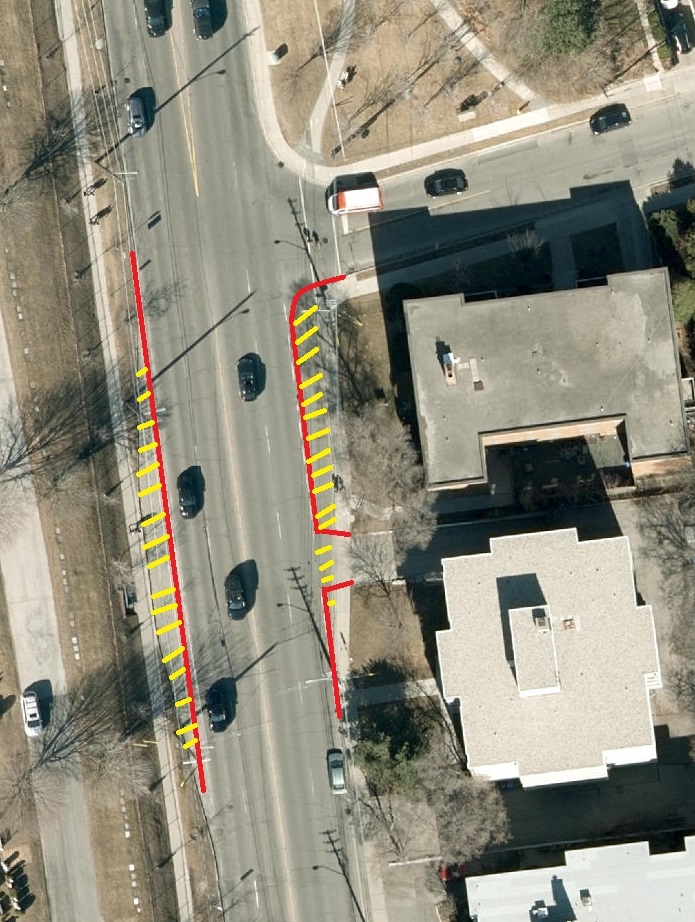 They got rid of all bus laybies except at the CNIB afaik. Also remove the NB stop at Glen Vale. The centre lane north of Kilgore is also reduced. Still...Yeah, from what I can tell looking at this stretch of road on Google Maps streetview and the photos in this thread, the curbs were completely redone (see red lines) to get rid of what is presumably an old bus layby on the west side and the rightmost lane for a bus stop on the east side (both shaded yellow). I am genuinely curious why the new curbs could just not be done at the curb line.