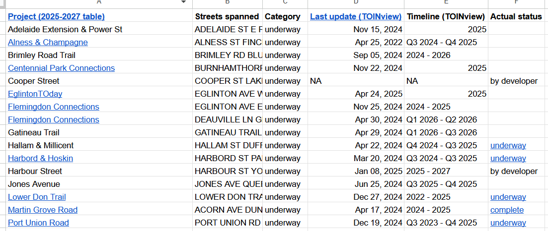 Thank you for your feedback everyone. I've incorporated your suggestions @TwoWheelPoli and @UntitledCyclist - the spreadsheet now lists the streets corresponding to each project name, specifies last update is from TOINview and which projects are by developers, with a few data updates. Some of the street spans have many entries, so the format is Street Affected Start Point End Point, with segments separated by commas. Some of the later NA entries may also have the roadwork timeline on TOINview but I didn't include it if it omitted that bike lanes were being put in. I will review the rest later but I also updated the St Clair TMP with 2024-2027 as it is also an infrastructure enhancement by Metrolinx. I was not able to find links for every project's webpage.