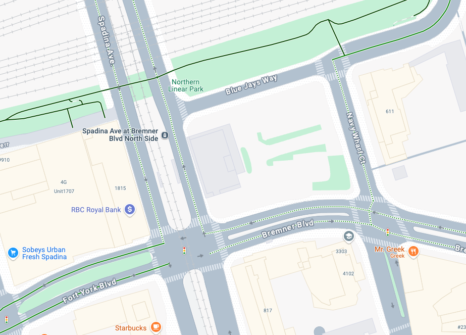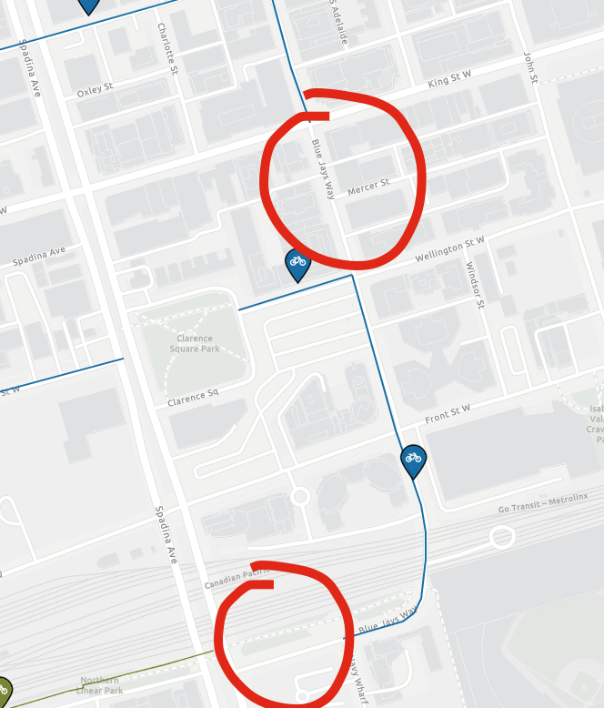 Staying on BJW, below Wellington, the poor bike lanes return but end again a block before Spadina. Once again, a potential connector stops short. Ideally this lane would continue across Spadina onto Iceboat Terrace, or perhaps down Navy Wharf to Bremner and across to Fort York to connect to Dan Leckie and the Waterfront. Google has some dotted green routes along some of these, but in reality there is no city bike infrastructure, just potential routes.