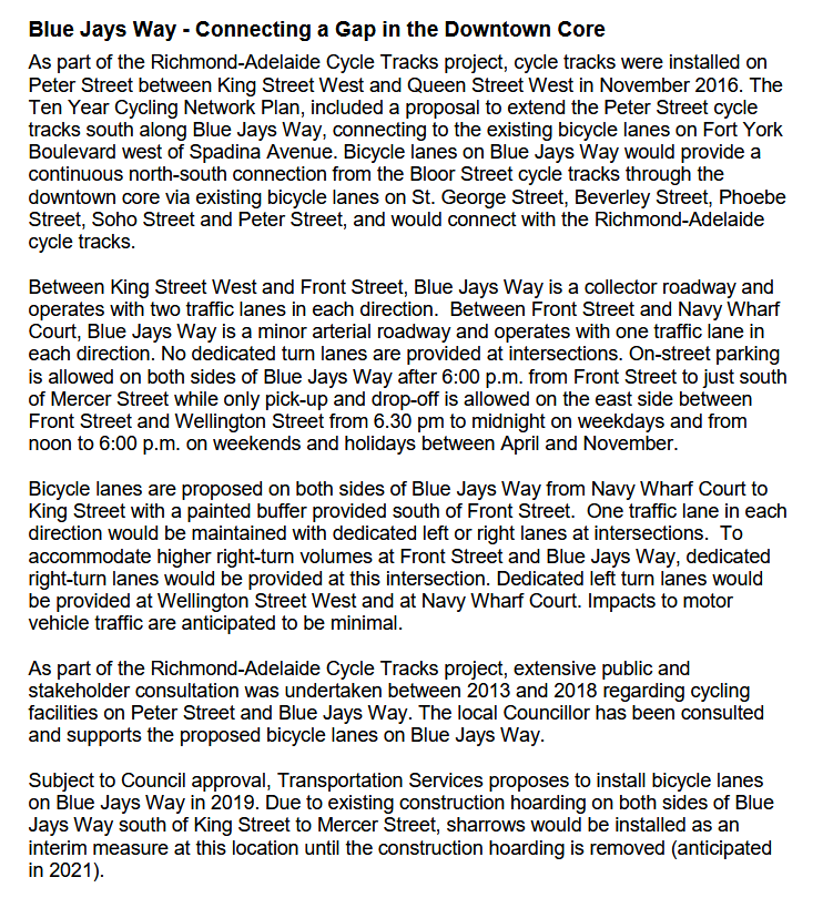 I e-mailed Councillor Malik about the missing bike lane and the awful pavement condition on Peter and Blue Jays Way last October and eventually got this response, which I may have posted in this thread then: