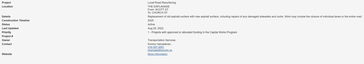 :• Reconstruction and upgrade of the existing bi-directional cycle track on the southside of The Esplanade between George Street South and Berkeley Street/Hahn Place, raising the bikeway to sidewalk level for improved safety and accessibility]