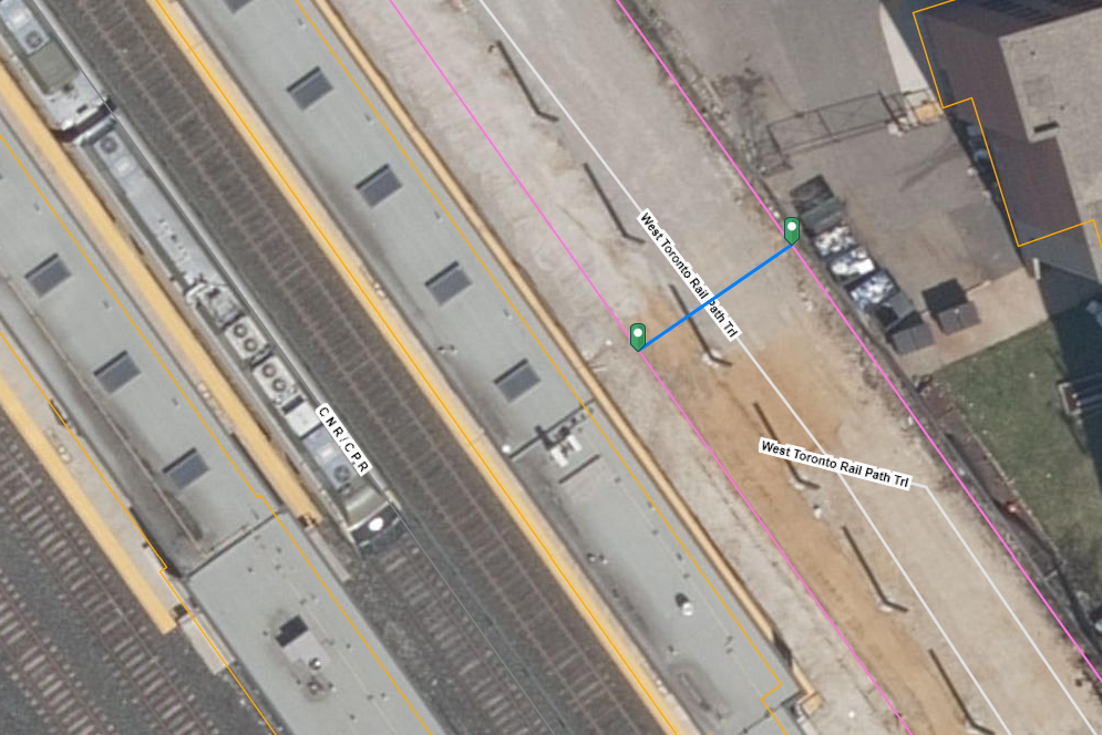 That blue line suggests the City owns 9.1M btw those 2 points. A typical multi-use path requires 4M (add 1M for light posts and such)