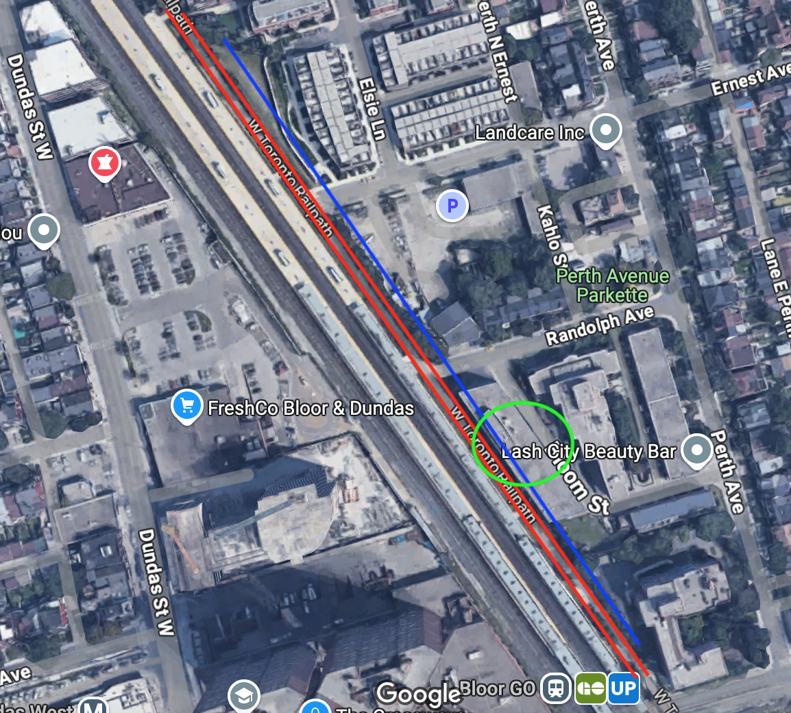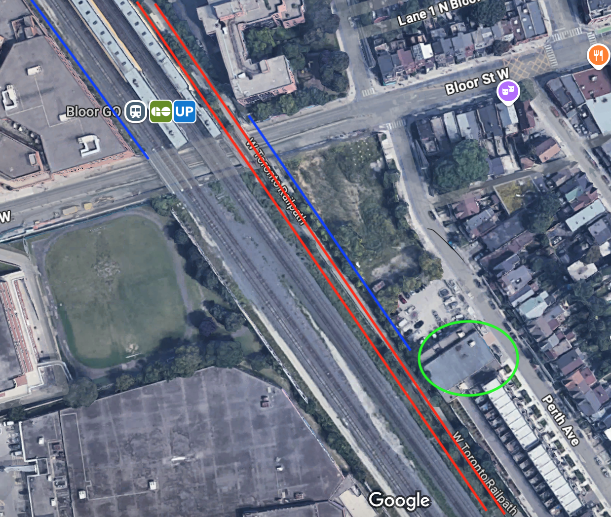 I labelled the new platforms blue. The new platform on the north side of the tracks might only 130 long, but I thought it could be full length if the building circled in green were expropriated and demolished. Alternatively, call it 2b, you could demolish the building at 21 Randolph north of Bloor and build a platform there, but 21 Randolph is a bigger building than the one south of Bloor.
