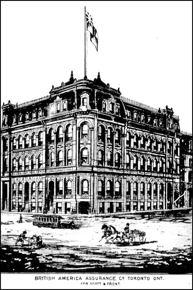 NW corner. It can be seen to the far left in this pic. Seems from the number of pics online it was one of the first in the area to become a parking lot.British America Assurance Company - image from Illustrated Toronto, Past and Present, published in 1877