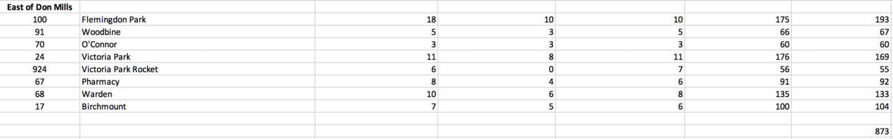 I have summarized the bus tally's for the corridor east of Don Mills Road. It's actually much higher when you consider the section between Yonge and Don Mills, but the east portion is where we're focussing: