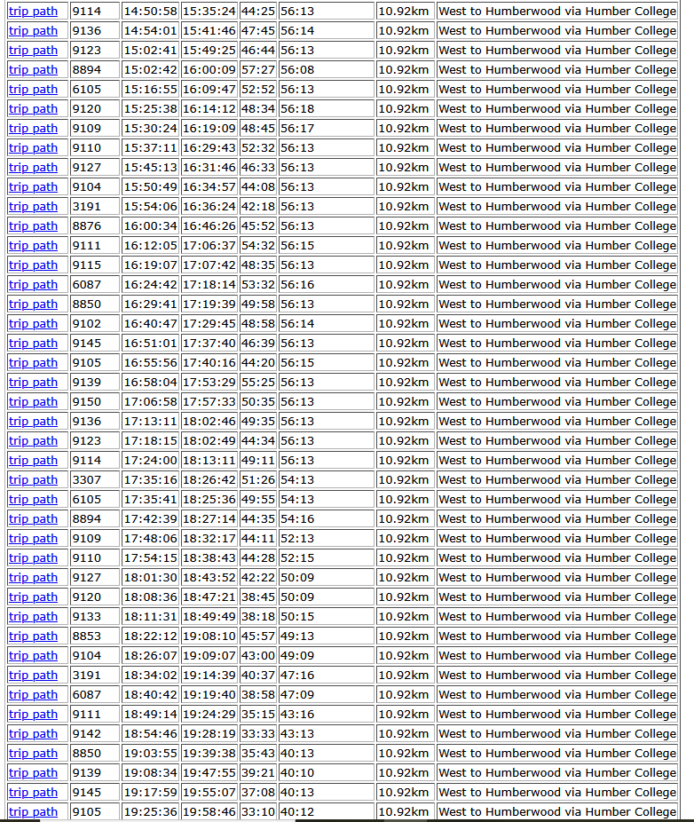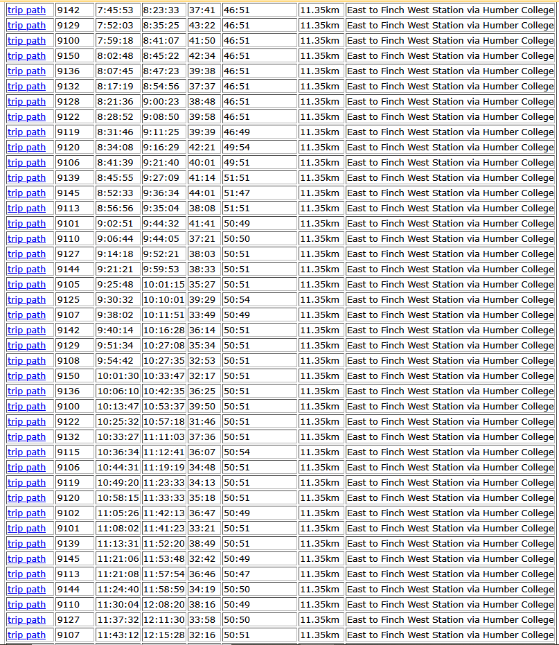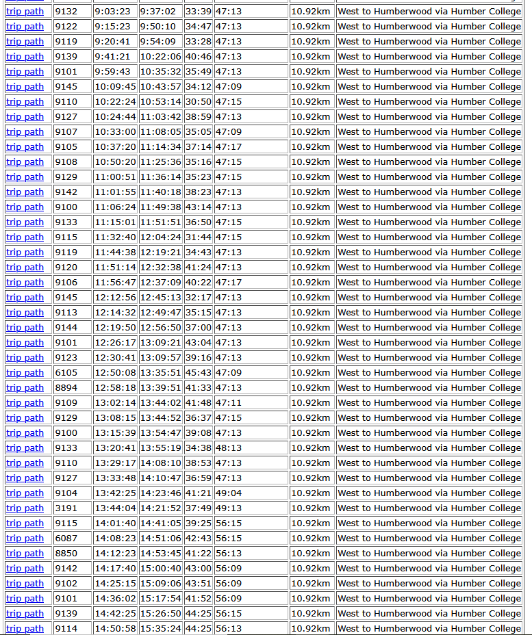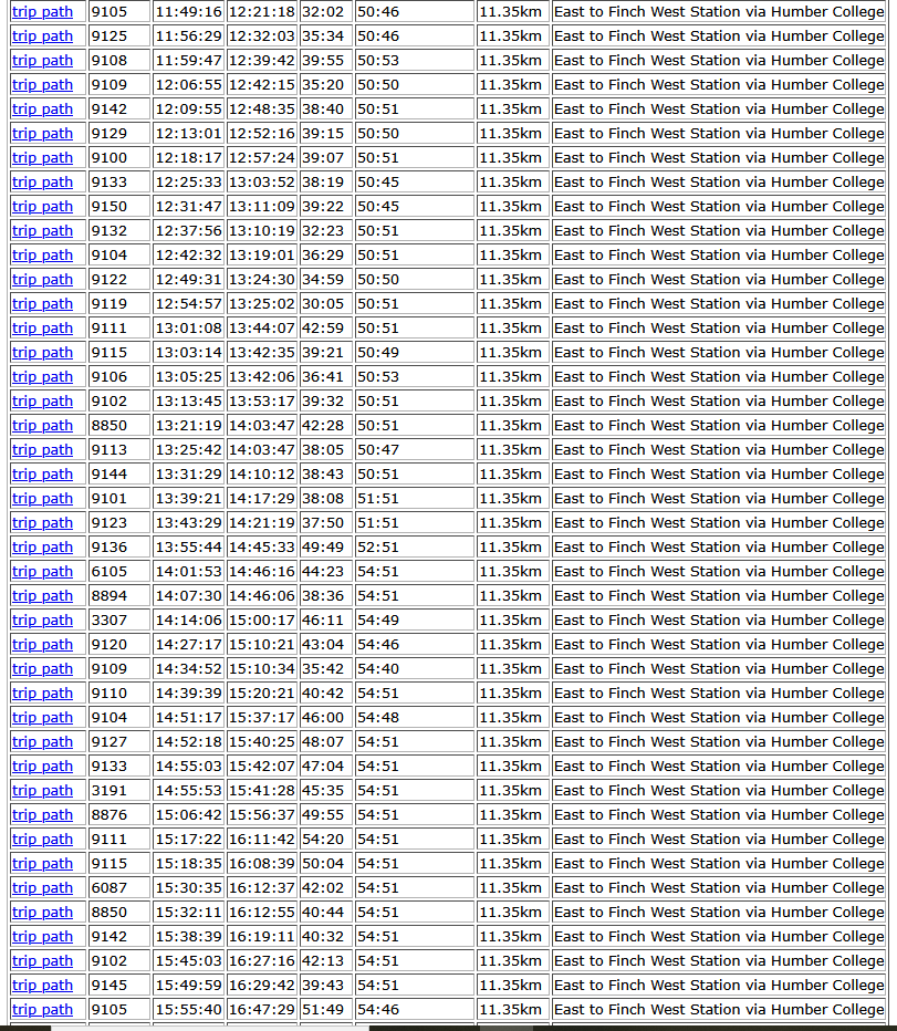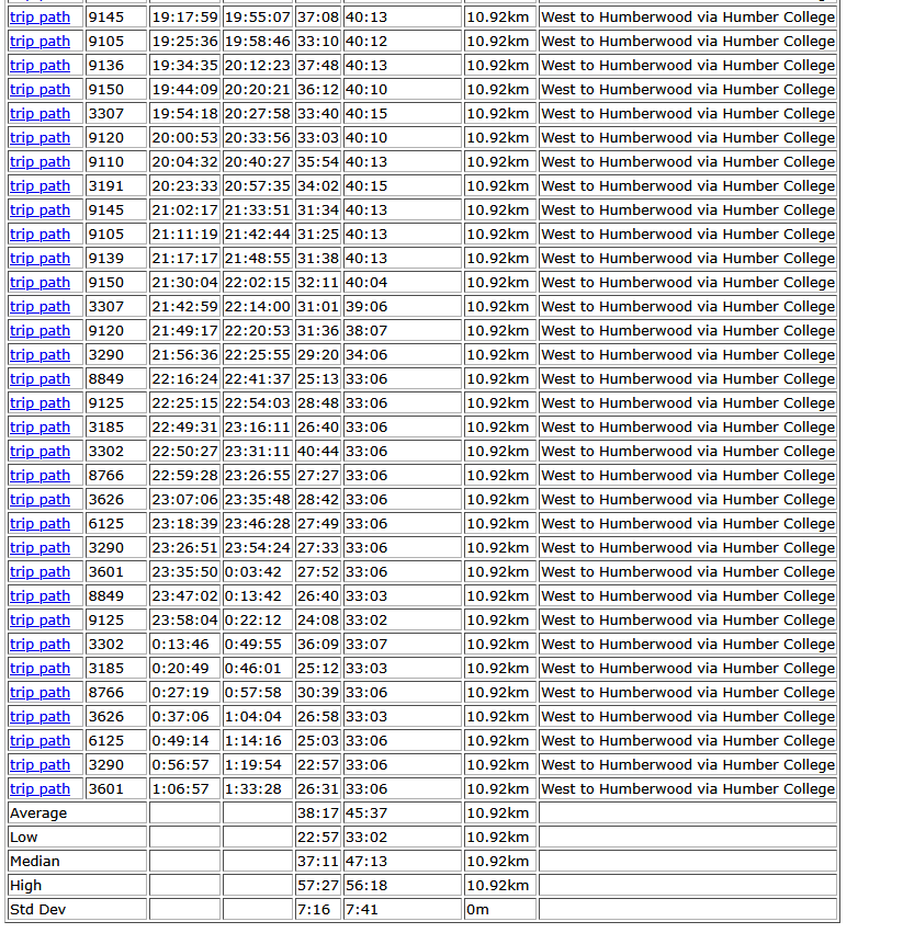 When I was looking randomly at some data a while ago, I think you could see a difference between a Monday and a Tuesday. What does Tuesday data look like. Kudos to @T3G for providing actual data!I am surprised that the bus 36 scheduled trip time is so much greater than the actual trip time. Maybe, the scheduled time includes several minutes for the terminal recovery?