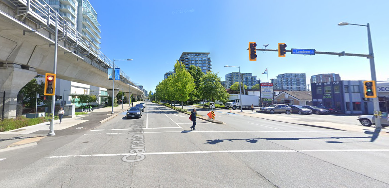 For clarity, when they built the Canada Line, the northbound travel lanes were moved into the footprint of the median busway while the guideway and expanded sidewalks were built curbside in the former footprint of northbound travel lanes. This reduces the actual width of the road and has the benefit of reducing crossing time for pedestrians and increasing safety. The intersection clearance time for vehicles is also reduced, allowing for a shorter overall traffic light cycle time.