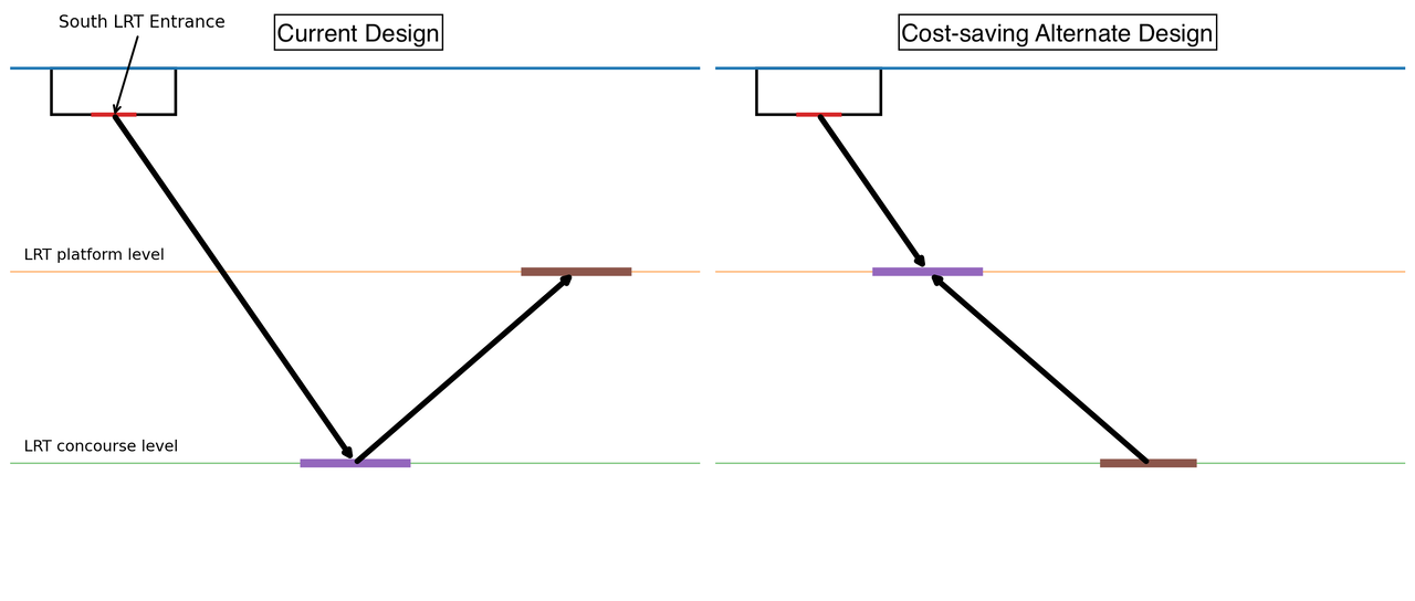 You cannot convince me there wasn't some shady dealing here. There is no way you pay triple the capital cost of Paris T9 even with two gaudy stations taking 40% of the $2.5 billion capital budget. Take out the two stations and that's still double the €480 million price for a worse end product. Half the carbon footprint of the project came from the massive amount of concrete wasted on two terminus stations. 20 to 30 kilotonnes of CO2 equivalent. They also wasted millions on making the escalator shaft for the new LRT entrance so deep. Logically, the escalator should've ended at platform level depth, but no, they had to make it as deep as the subway station concourse and then build another set of escalators 10 metres