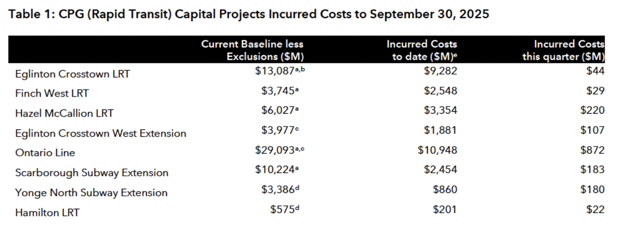 Now that Line 6 is complete and running, the construction (capital) costs are fully paid for on the books, which includes the capital financing costs. The remaining $1.2 billion out of the overbudget $3.7 billion current all in cost is mostly for the 30 year maintenance contract. The non-maintenance side of the contract is >$2.548 billion since that figure was already incurred 2 months before opening. Not exactly surprising for construction costs to double for a P3 project in Ontario (change orders).