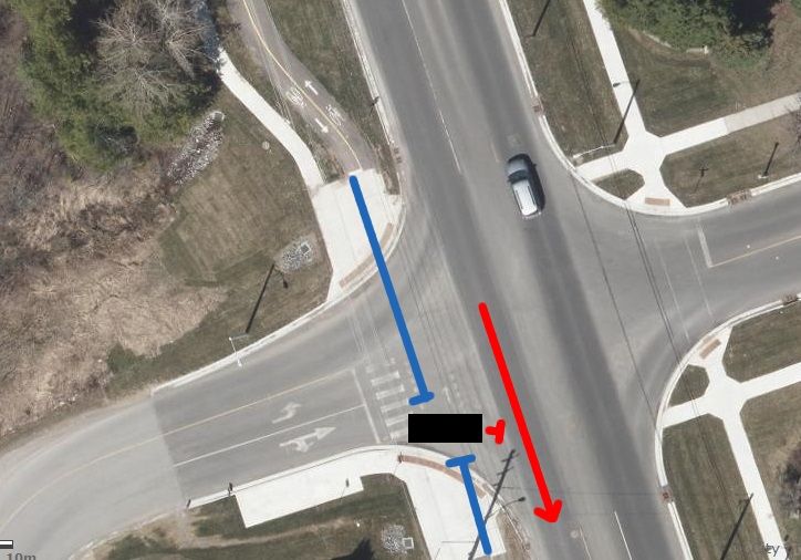 Besides, there definitely is enough room to realign the path, since the spur on the north side dead ends at the crosswalk and is too short to use for anything.