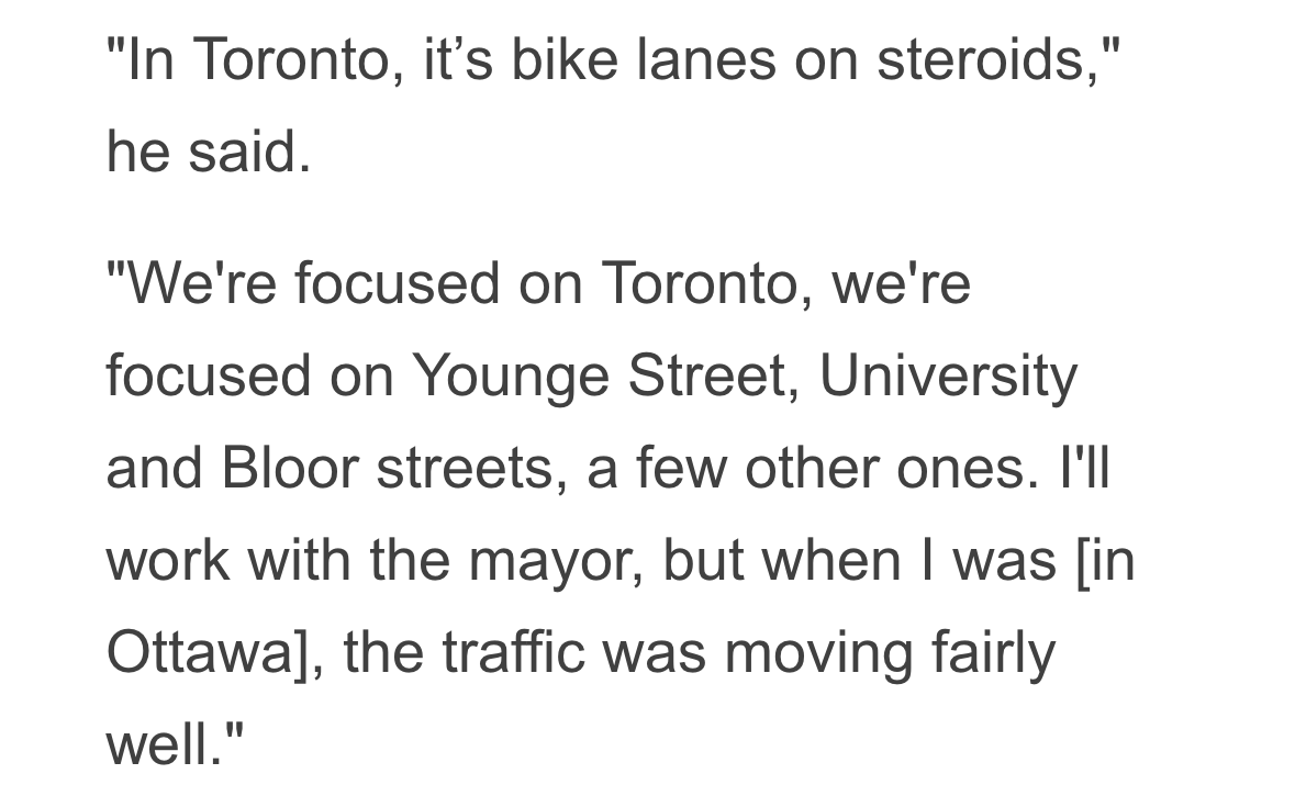 But those are the cards we're dealt. The difference is how you deal with them - and I would argue that eliminating car lanes across the Province's capital city without any regard for possible push back from the city's overseers at Queen's Park was a predictable folly. Premier Doug Ford has been complaining about Toronto's bike lanes since 2018, and was a vocal opponent of them when he was on Toronto city council. We elect and expect our municipal politicians to be able to understand, anticipate and work within both the official regs and personalities coming out of Queen's Park.