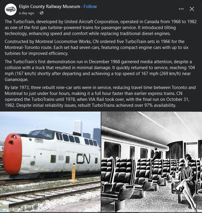 The speed listed in the post is wrong. The American TurboTrains did a similar speed test as the Canadian ones in the late 1960s, and managed to achieve 167mph. The Canadian ones, by virtue of being longer (and thus heavier), and with less track to take a run up, "only" achieved a top speed of 140mph.