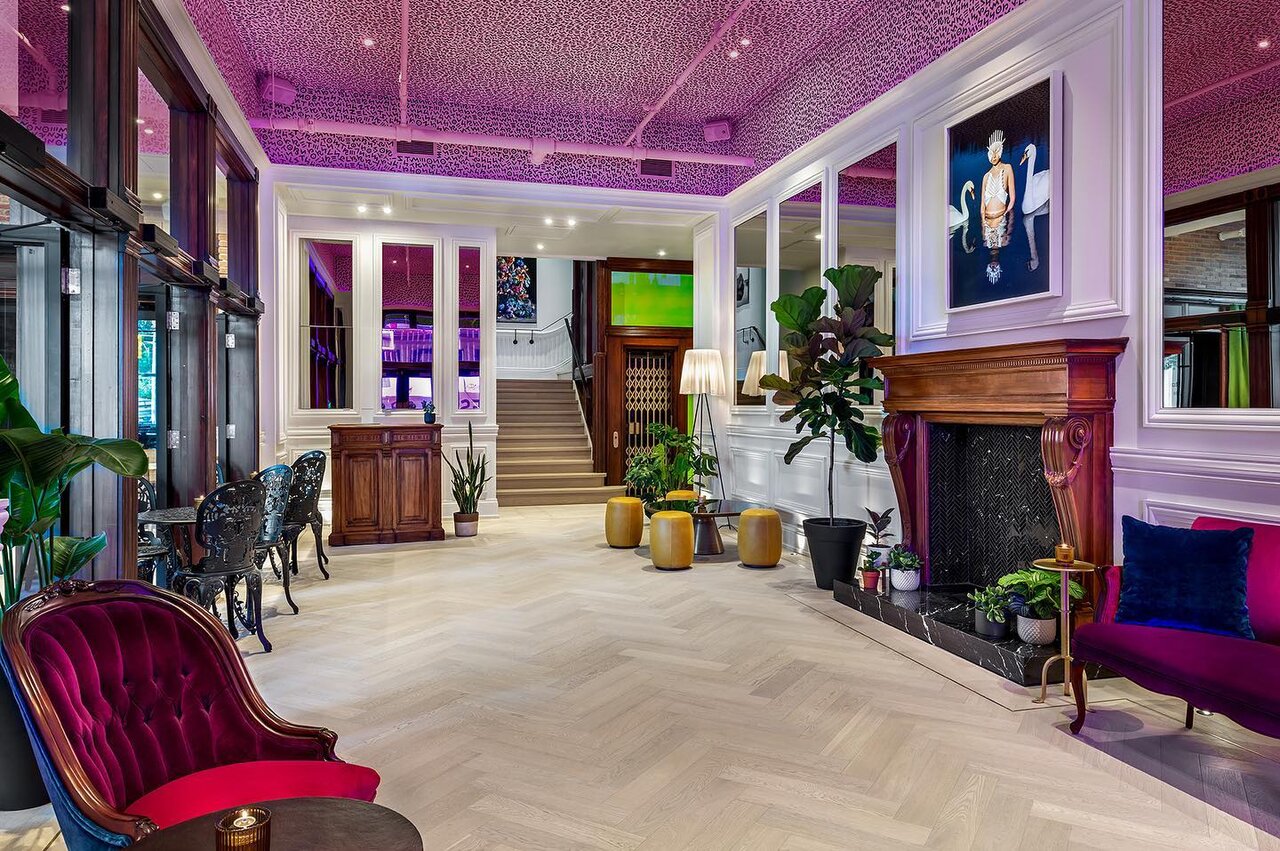 Designed by Elastic Interiors, the large front desk in the hotel’s lobby is replaced by soft seating cushions, a fireplace, and an understated antique check-in desk, according to Les Mallins. The place also features contemporary artwork, restored exposed bricks, and innovative lighting applications.