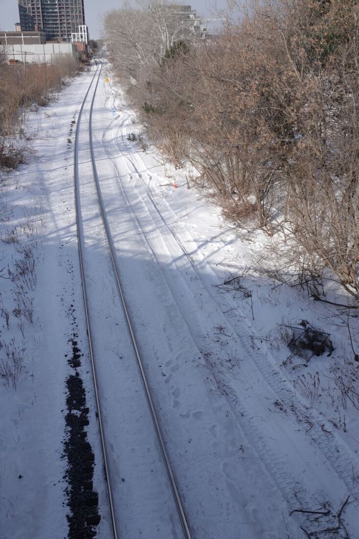Compared to the the second photo in this post from a few months back of the Barrie line, I think some trees and shrubs might have been cut down in the area beside the railway track towards the fence that separates it from the back of the French-language high schools. I assume this likely indicates some intention to start work towards a second track in the coming months.