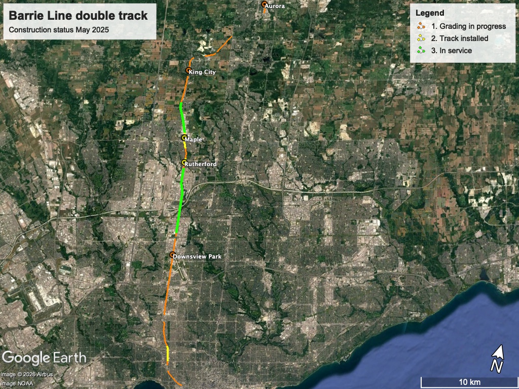 I'm quite excited by the progress between Maple and Rutherford. Rutherford station is complete with the 2nd track installed, Maple station is almost complete with the 2nd track installed, and grading is well underway for the adjacent segments. So it looks like we could have 13.5 km of continuous double track in service by the end of this year. That track isn't enough on its own to allow 30-minute bidirectional service, but it would make it possible to run two trains back-to-back every hour. For example, instead of the Barrie trains just being extensions of certain hourly trains to Aurora, they could run separate express trains to Barrie in addition to the hourly local trains to Aurora.
