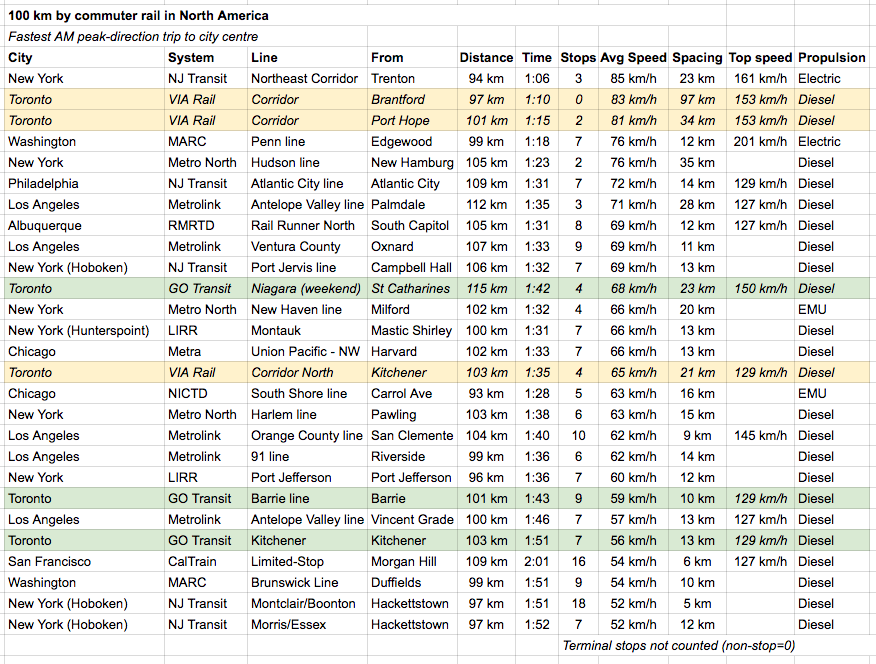 In North America, it is very unusual to have a commuter rail line with a 2-hour travel time, but it is not that unusual to have a line that covers 100+ km. Here is a summary I made last year of all commuter rail lines in North America which cover 100 km. For each line I picked the fastest AM peak-direction trip to the city centre from the station closest to the 100 km mark. I also included the Toronto VIA lines and GO Niagara service for reference.