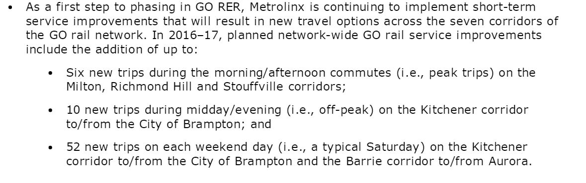 Currently, there are four morning trains and four afternoon trains between Kitchener and Toronto, and $1.2 billion was invested between 2010 and 2015 to improve the corridor between the two cities. But extensive new construction and upgrades are still required to further boost service and speed trips up to the 70- or 75-minute range from the current two hours or so.