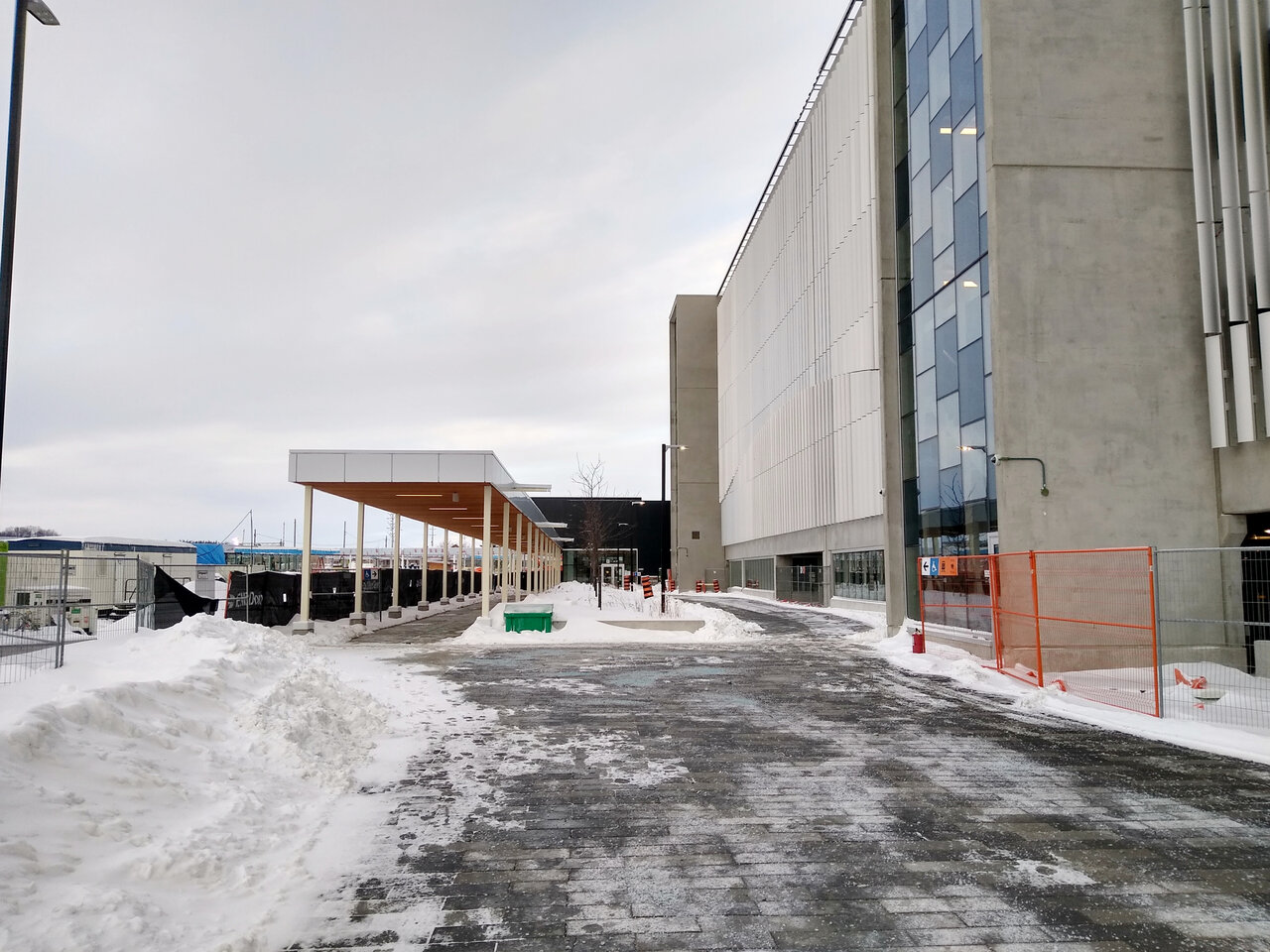 ... so the pedestrian route to the waiting room and bus terminal passes through the parking garage instead.