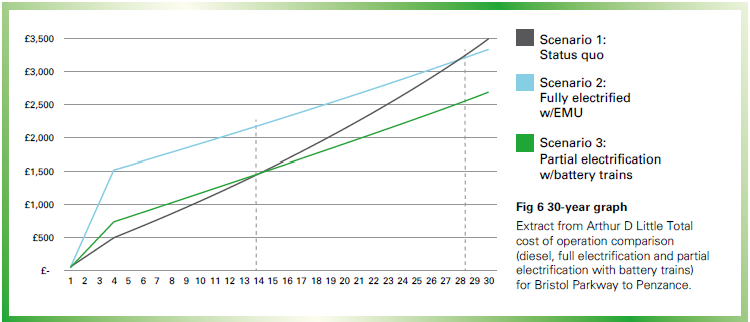 It looks incredibly cheaper in the upfront infra costs, although this study was done by retrofitting trains with electric motors already fitted. GO trains would need to fit batteries and electric motors, or entirely new cars.