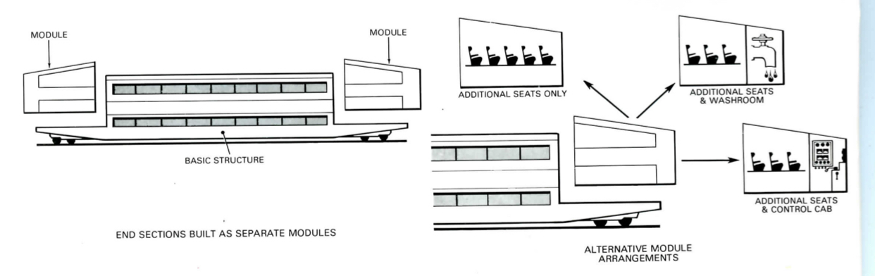 There was a 4th module not shown in this diagram that would have replaced the passenger areas with engines to make the coach a multiple unit, which was never ordered by any agency.