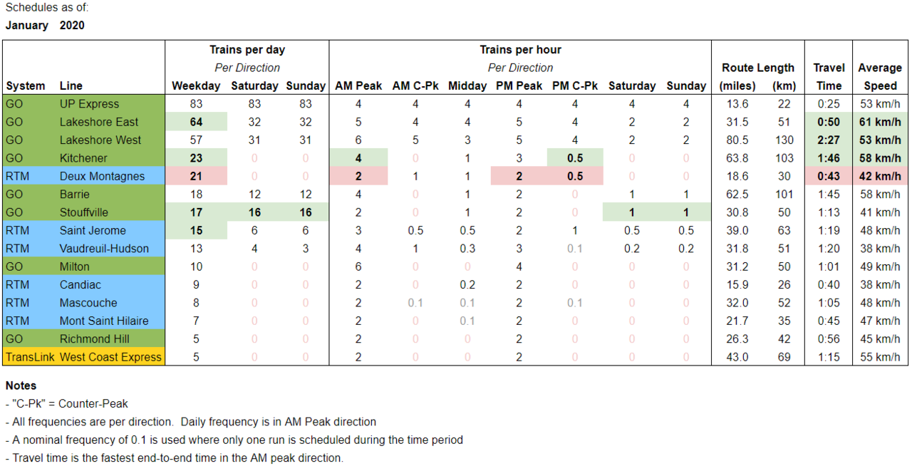 At the start of 2015, most GO Transit routes only operated in the peak period in the peak direction, while AMT (now RTM) routes also had a few off-peak trips. But now at the start of 2020, many GO routes have all-day service far exceeding that of their Montréal counterparts.