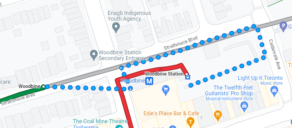 The 5-minute walk from the bus platform at Woodbine station to the westbound subway platform. Which seems to involve jumping over a fence, going through the parking lot, east to Cedarvale, up to Strathmore, head west, back to Woodbine Avenue, then south to the main entrance to the subway station! (I should probably move this to the Google Maps thread).