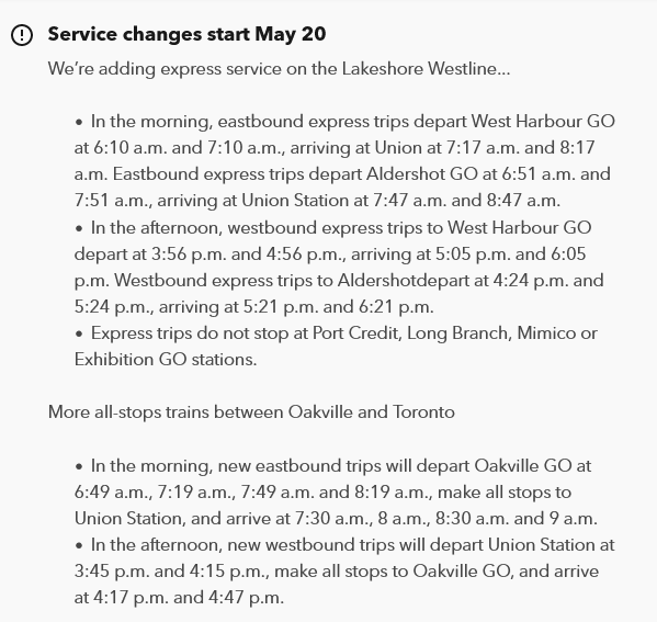 Lakeshore West service also notably now matches pre-covid schedules, which also had 9 peak period express trips. Now if they could just match the off-peak service levels and bring back 20-minute service to Oakville!