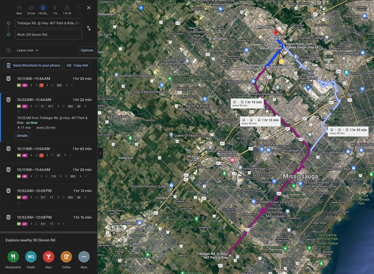 You’re looking at the weekend schedule on Google Maps. During weekdays, you have another potential route that could simplify your commute. Route 56 service actually starts at Oakville GO and goes to Bramalea GO. This could offer you a more direct and potentially faster option for getting to work, without the need to drive to or transfer at the Trafalgar park & ride. It might be worth checking out the weekday schedule for this route to see if it aligns better with your needsI was messing around with Google maps. I wanted to see what was the best route for transit to get to work. I live in Oakville and work in Brampton. I always drive to work, never taken transit.