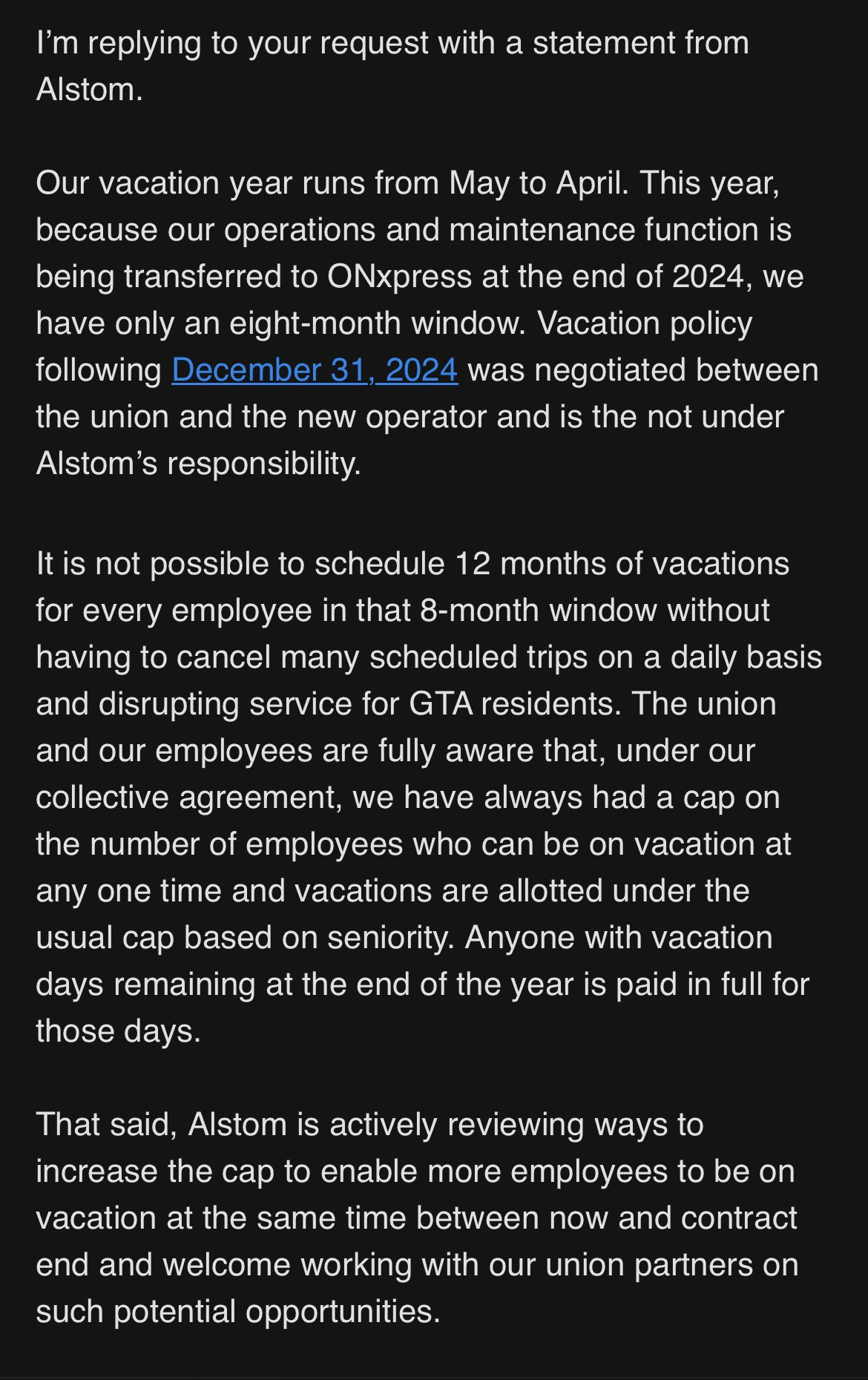 CityNews (Twitter) says Alstom is restricting GO personnel vacation for the remainder of the year