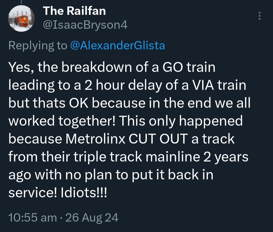 Couldn’t have said it better, in the end we all gain from the work being done on the Lakeshore East Line right now, people that complain like the one in the screenshot above clearly don’t understand what work is happening and why it needed to happen. Which is a bit ironic because their name is The Railfan…They cut out the third track because they needed room to build the Ontario line and widen the corridor to 4 mainline tracks. Not only is there a plan to restore 3-track operations, but the whole point of the closure is to add a new 4th track that had never previously existed. Metrolinx has done a lot of stupid things over the years but temporarily reducing LSE to 2 tracks during construction is not one of them.