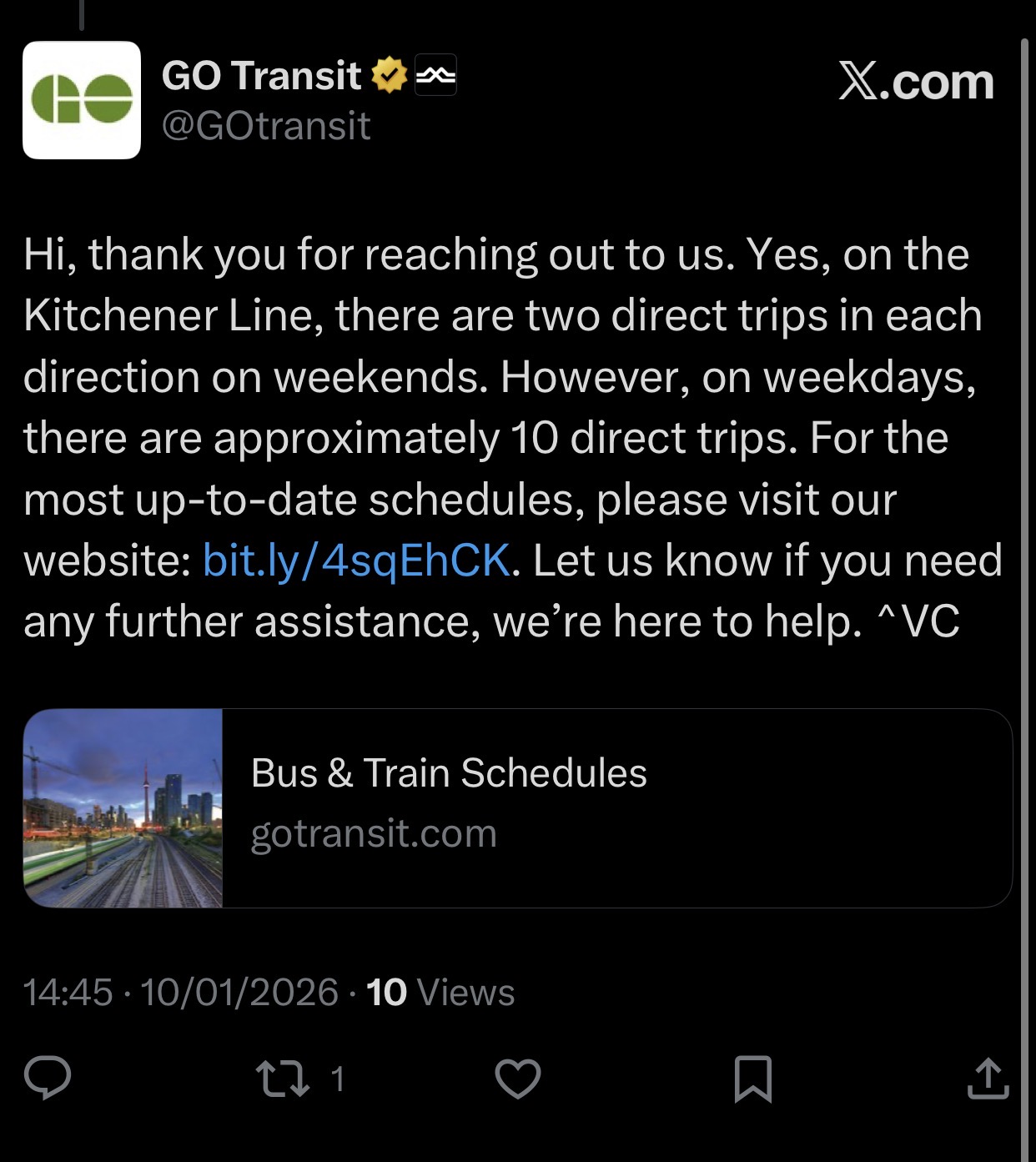 This KI weekend service discrepancy continues to grow. Earlier today the GO Transit social media account was responding to customers questions with wrong information, saying 3 of 4 weekend trips were cancelled. The same questions we were asking weeks ago when there was a mistake in the PDF timetable: