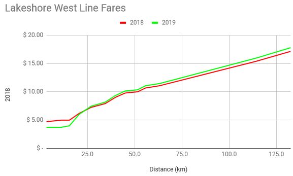 Plotting distance against fares, it looks like the reduction in short trips was implemented in a sort of band-aid manner. Looking for example at the Lakeshore West line, you can see the new $3.70 short trips, and above about 30 km, it looks like the usual slight fare increase tacked onto the existing fare. But between about 15 and 30 km, there is a very steep increase in prices.