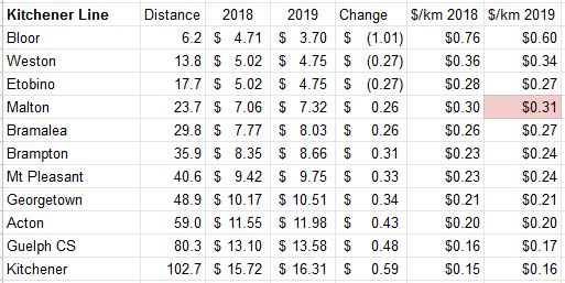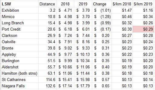 A particular anomaly is Weston station. Rather than the $3.90-ish fare you'd expect based on other stations a similar distance from Union, it has a $4.75 fare. Meanwhile on the opposite extreme, we have Eglinton station on the Lakeshore East line, which really should not have a $3.70 trip to Union given the 17 km distance. It really gets a sweet deal compared to Downsview Park, which is exactly the same distance but is receiving a fare increase rather than a $1.32 reduction.
