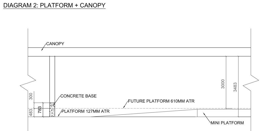 Rutherford Station (reconstructed 2022), note tall foundations for pillars and shelters, and space for a centre 3rd track