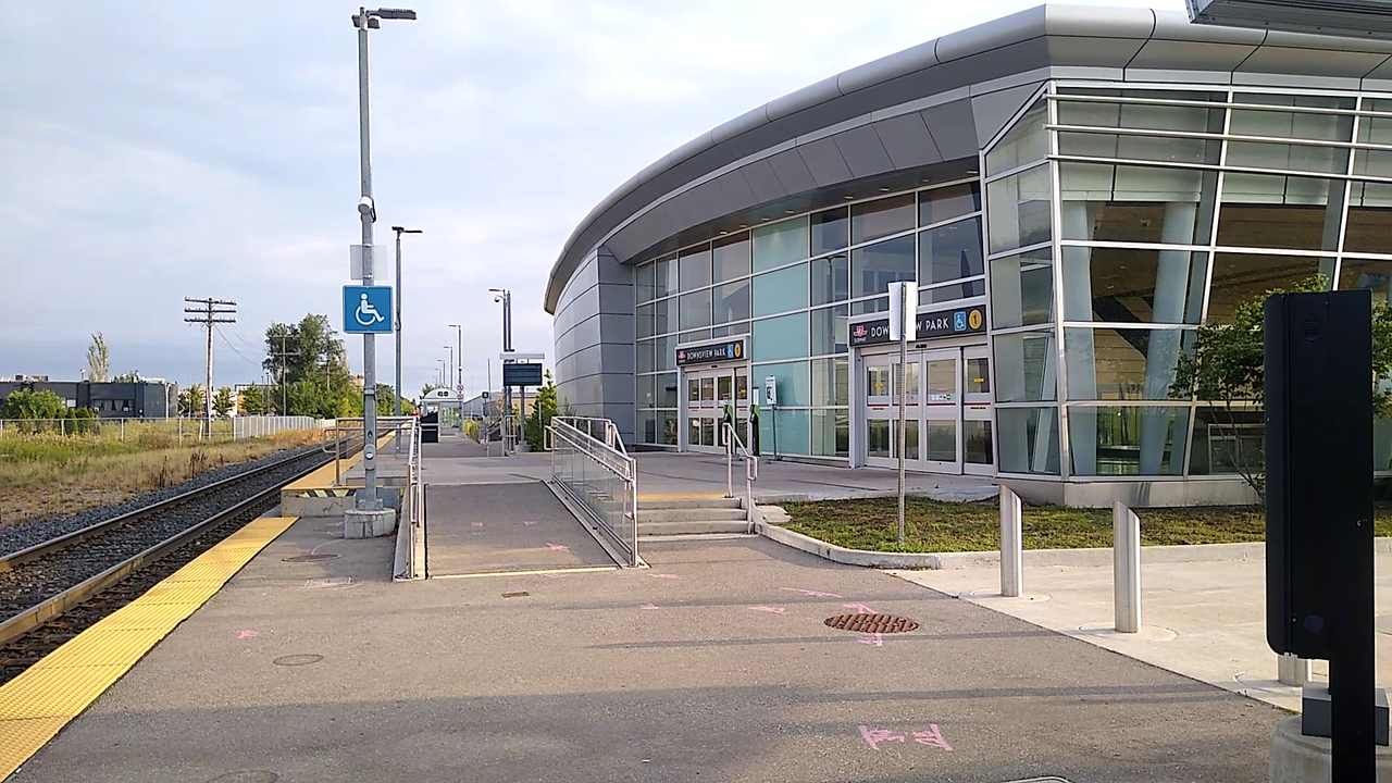 Bloomington Station (opened 2021), note the height of the entrance onto the platform. The station is also on a siding used exclusively by GO.