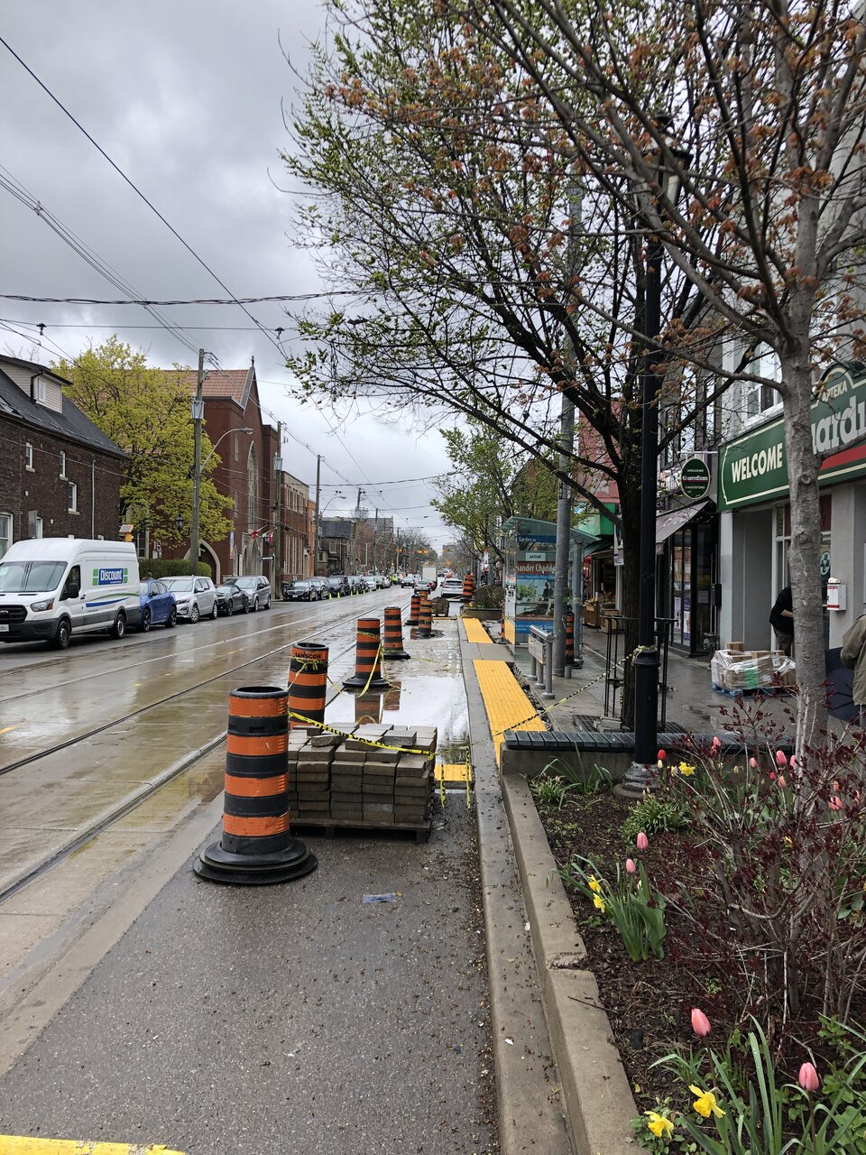 OK, so is that's what's happening here? Some civic standoff where the TTC/City is waiting for the BIA to produce some pavers and in the meantime there's just a small passageway maintened to each streetcar platform? That's no way to run a city.
