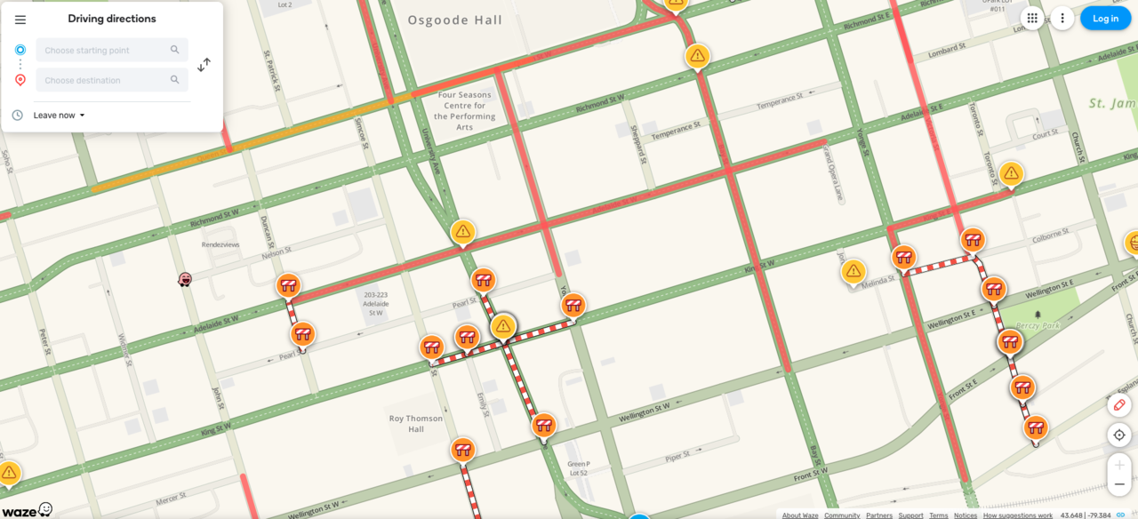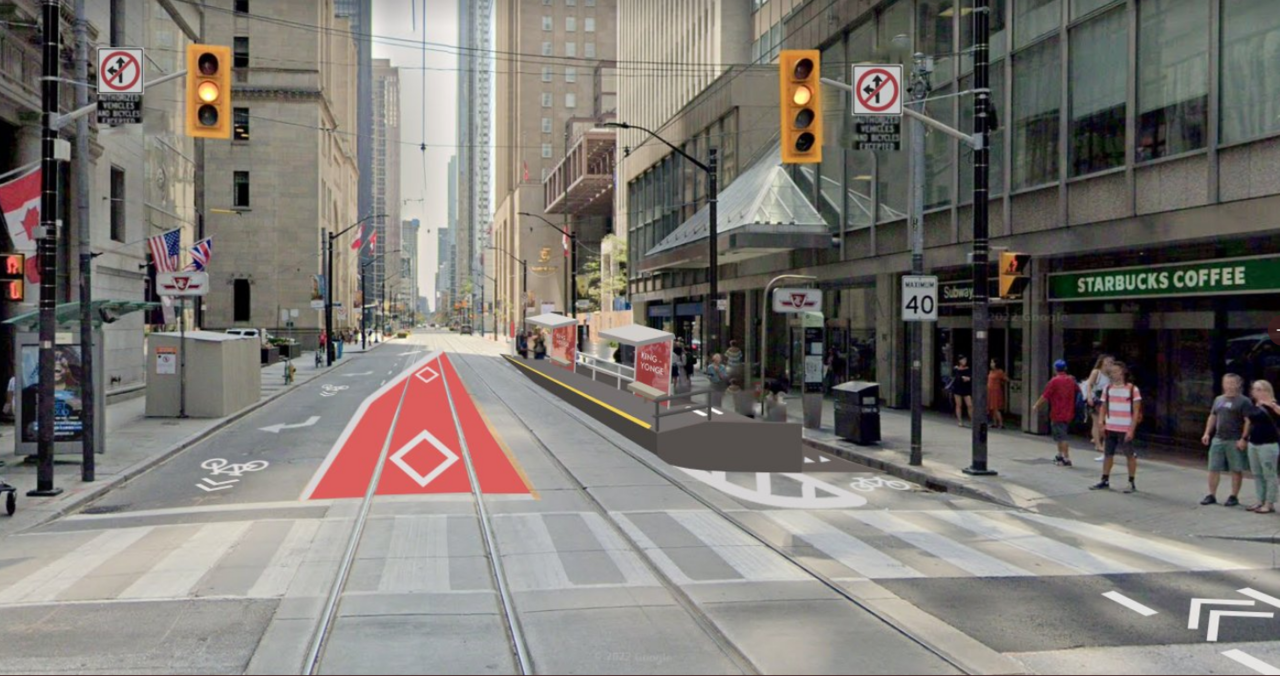 You'd have to add traffic lights on the opposite side of each intersection and also figure out how to get the middle lane to travel the opposite direction of all other traffic?If we had double-ended streetcars, we could have put in temporary crossover tracks west of Simcoe Street and east of York Street, and not use buses at all.