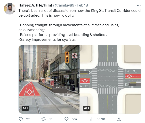 UT's @H4F33Z has put forth his ideas for improving the King Street Transit Corridor below. I like what I see here, I'd work on the streetscapes too, but he was focusing on function