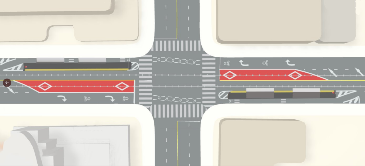 By banning straight through traffic how do you do deliveries to those business'?I would have added red, yellow, and green right turn arrow lights, and transit priority signal lights. Over the lanes AND catenary lines.