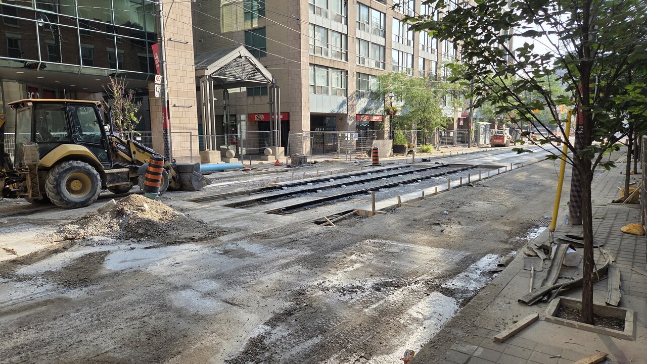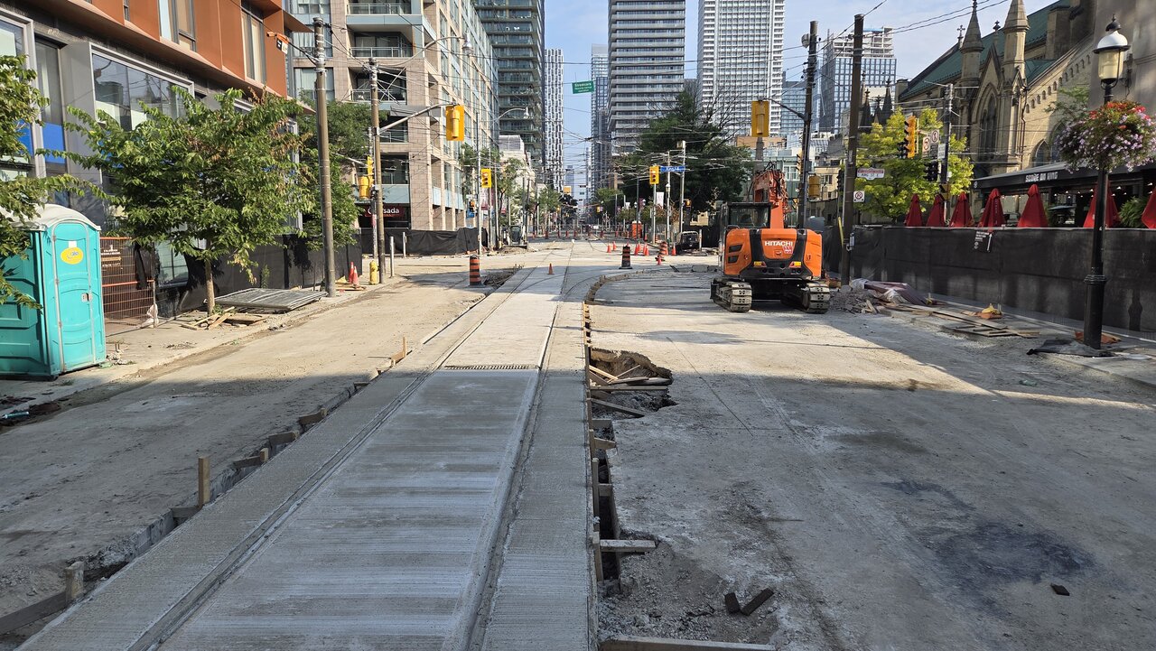 The tracks will certainly be done but they then need to fix the sidewalks and, I think, grind and repave the roads. Of course, getting the track done does not mean streetcars will restart at once, they need to connect the new electrics and test the overhead, I understand the plan is to bring the streetcars back just after Labour Day. The City have also marked lots of sub-standard sidewalks on Church between The Esplanade and, at least Dundas. I assume they hope to fix them this year too.King and Church is definitely close to being finished. They are not working this weekend though from what I can see.